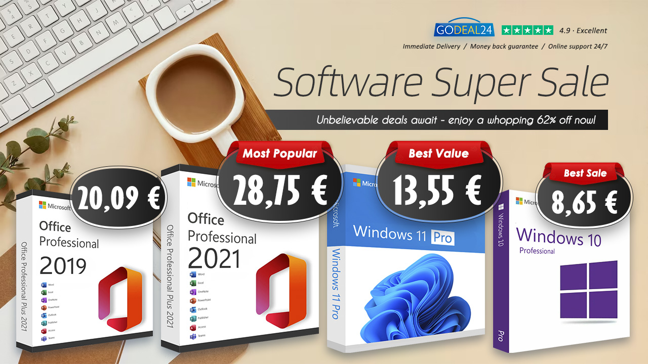 Na Godeal24 můžete ušetřit spoustu času a peněz díky zvýhodněným licencím Microsoft, ověřenému softwaru pro zabezpečení IT a dalším počítačovým nástrojům. Získejte operační systém Windows a kancelářský balík MS Office za bezkonkurenční cenu. Zažijte bezproblémové nakupování s digitálním doručením Godeal24, které vám zašle software přímo na váš e-mail během několika sekund po nákupu. Navíc díky 98% hodnocení TrustPilot Excellent a odborné technické podpoře 24/7 si můžete být jisti kvalitou kupovaného produktu.