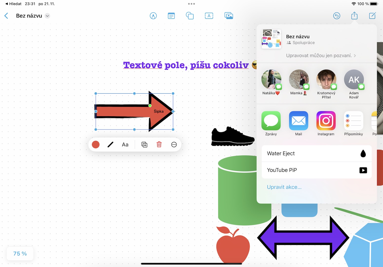 Jak už jsem zmínil, tak prakticky u každého objektu či textu můžete velmi jednoduše měnit barvy. Vždy jen stačí, abyste konkrétní objekt apod. klepnutím označili, čímž se nad ním objeví malé menu. V tom pak klepněte nalevo na ikonu barvy, kde už si ji následně můžete jednoduše nastavit. Hned vedle ikony barvy pak najdete také ikonu tahu, u kterého lze opět nastavit barvu, velikost, a dokonce styl. Do některých tvarů lze pak také klepnutím na Aa vkládat text, což může přijít vhod.