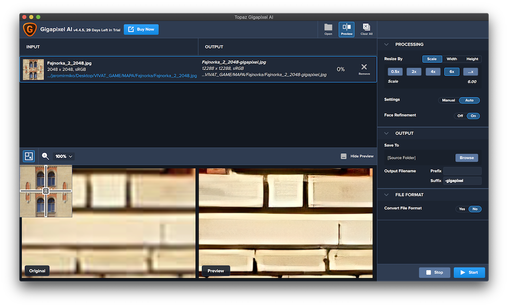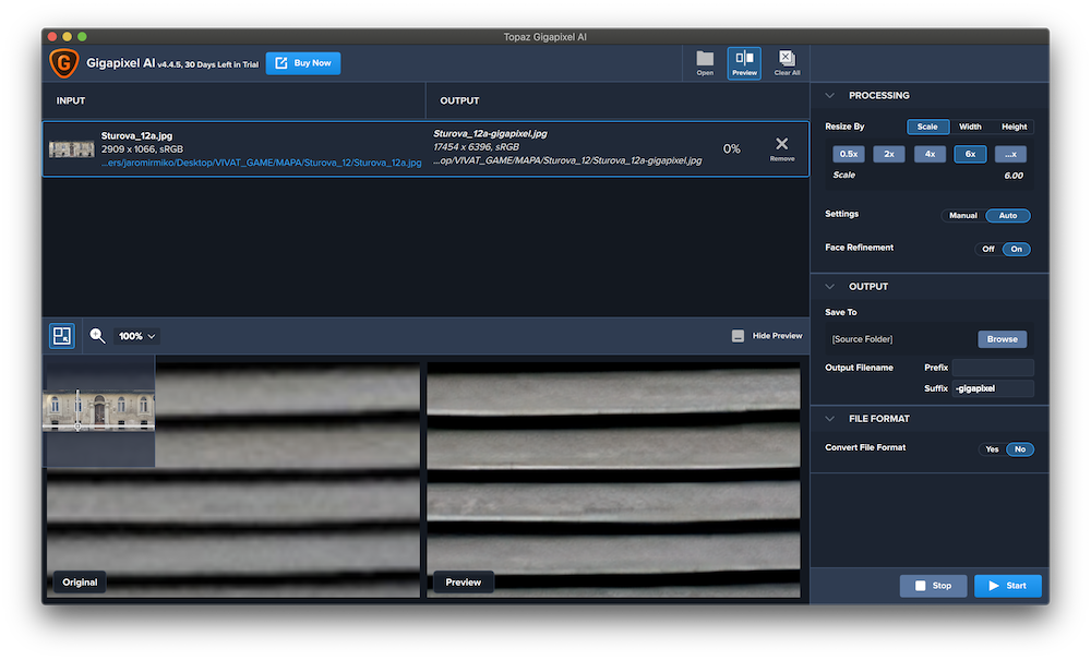 Aplikace nabízí defaultní možnosti upscalingu o 0.5x, 2x, 4x a 6x, ale můžete zadat i libovolné číslo, pokud vám ani jedna možnost nevyhovuje. Jak jsem již zmínil, umělá inteligence podrobně analyzuje fotografii a sama ji vylaďuje a jak bude váš výtvor ve výsledku vypadat, máte možnost poznat díky živému náhledu a možností pohybovat se po něm. I u náhledu je ale třeba chvíli počkat, hlavně když přeskakujete mezi různými částmi obrázku. Samotný import fotek probíhá díky drag-and-drop. Ve výsledku je i samotná aplikace extrémně lehká na používání. Ale zato opravdu náročná na hardware.