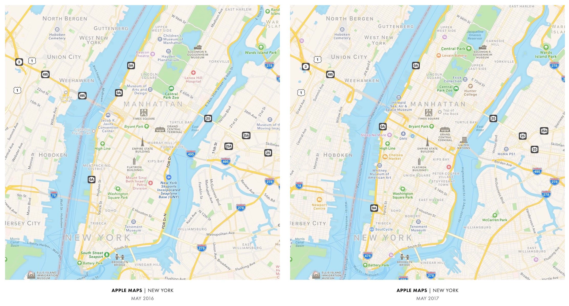 Apple Mapy se oproti tomu během uplynulého roku prakticky nezměnily, přestože výrobce iPhonů před rokem na WWDC oznámil pro své mapy zcela nový design. Pohled do jablečných map v květnu 2016 a květnu 2017 zanechá stejný dojem, jak znovu demonstruje O’Beirne. Zčásti to může být i kvůli tomu, že Apple obvykle své služby aktualizuje jen jednou ročně, a to právě na vývojářské konferenci.