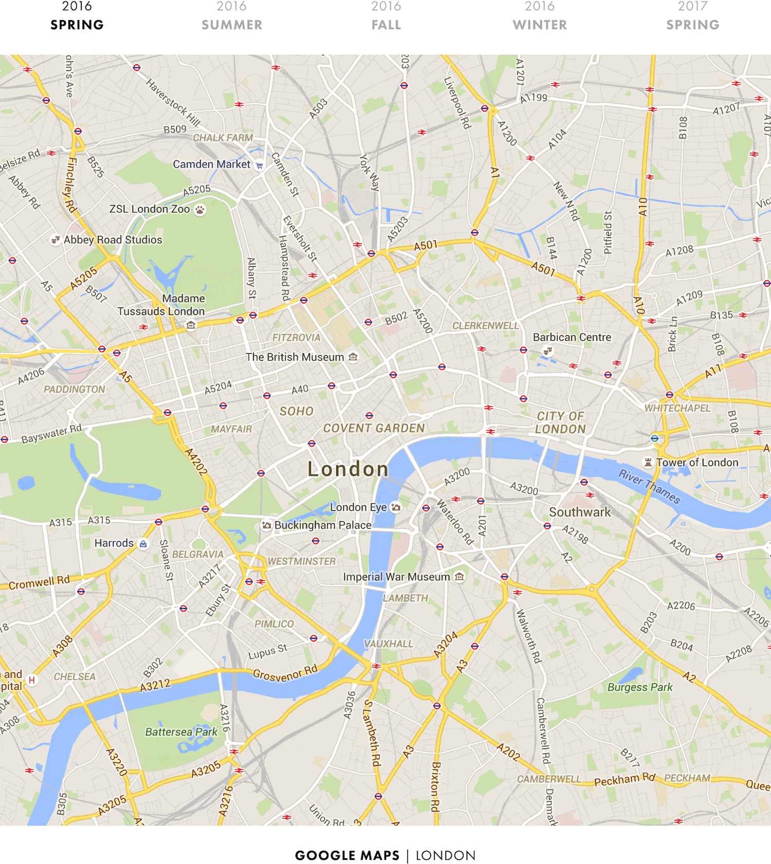 O’Beirne pořizoval pravidelně celý rok snímky konkrétních oblastí, aby je mohl následně srovnat a zjistit, co se změnilo a kam obě služby míří. Můžeme si tedy všimnout, jak se v čase proměňovaly a aktualizovaly data o různých bodech zájmu, jak je má Google – i díky Street View – v některých ohledech přesnější, a jak se naopak Google inspiroval u Applu ohledně grafických značek.