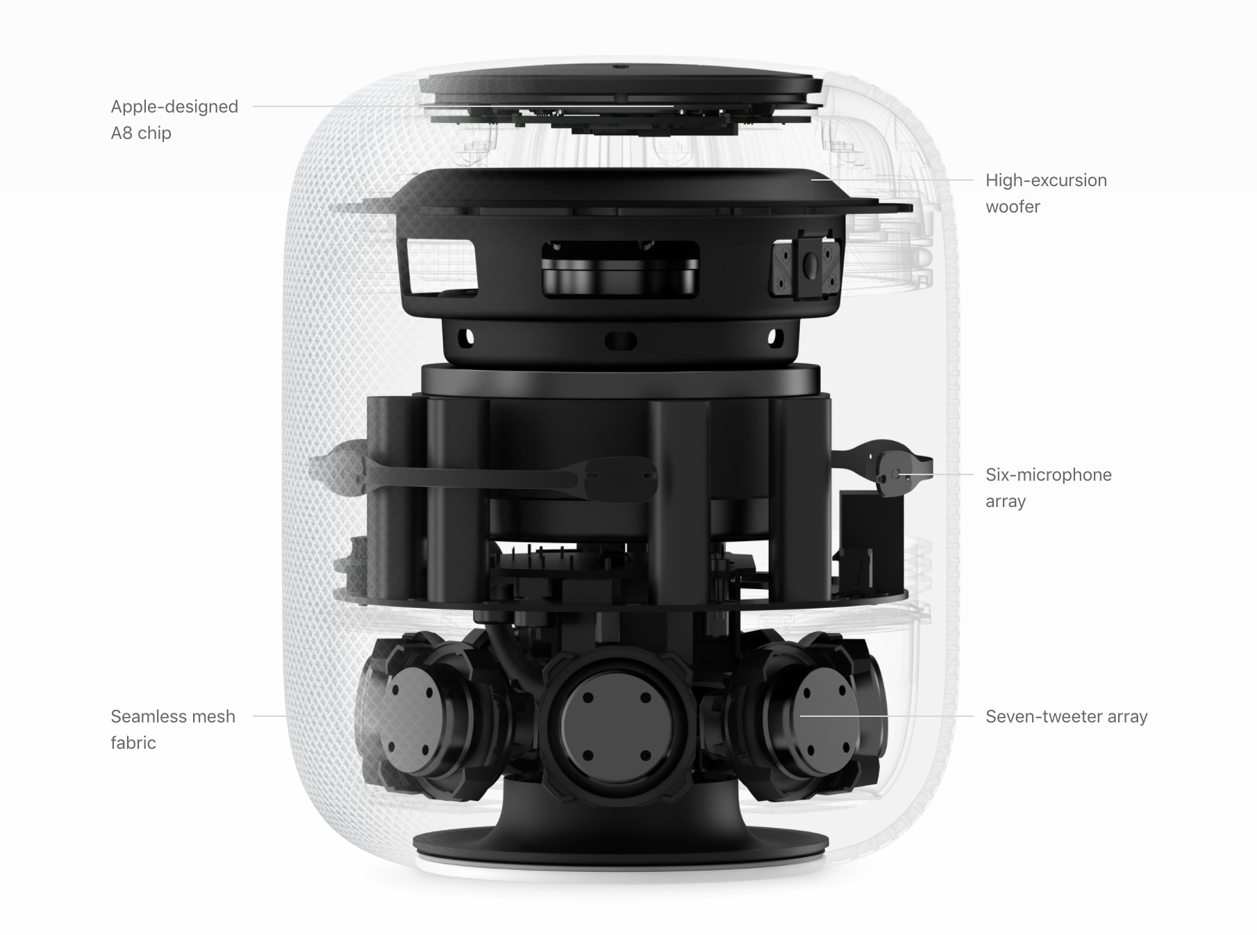 Sonos ostatně zmínil sám Schiller. Podle něj je HomePod propojením právě reproduktorů s vysokou kvalitou hudební reprodukce a reproduktorů s chytrými asistenty. Proto se Apple významně soustředil na „zvukové“ vnitřnosti, které dokonce pohání čip A8 známý z iPhonů nebo iPadů.