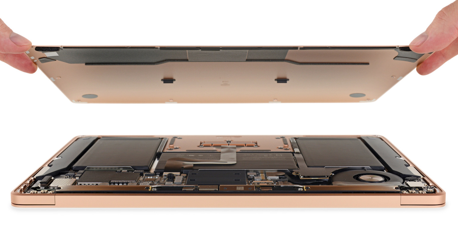 Nový MacBook Air je složený víceméně stejným způsobem jako všechny MacBooky z předchozích let. Spodní díl šasi drží několik pentalobe šroubků, po jejichž vyšroubování je možné kryt sejmout. Následuje pohled na vnitřní rozložení komponent, ze kterého lze mnohé vyčíst. Při pokračování v rozborce se ukázalo, že jde vše relativně snadno. Základní deska drží za pomocí šesti šroubků. Podobným stylem je uchycen i ventilátor a komponenty jednotlivých portů. Jak PCB na levé straně počítače s dvojicí Thunderbolt 3 konektorů, tak PCB vpravo s 3,5 mm audio konektorem je modulární a jejich demontáž je relativně snadná.