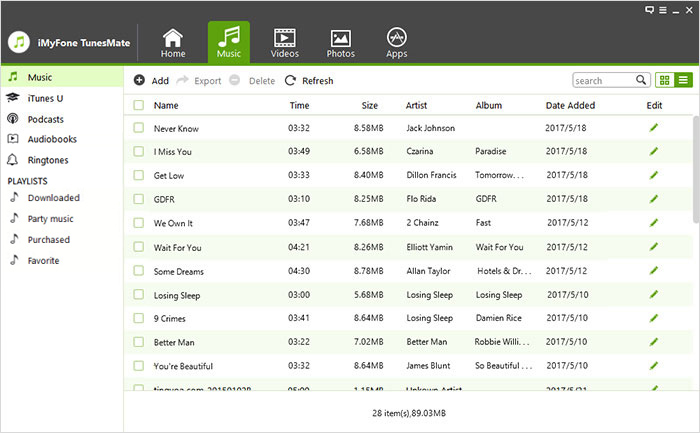 V záložce Music se vám zobrazí detailní informace o audio souborech, které se v iPhonu/iPadu/iPodu nachází. Můžete je zde následně upravovat, přejmenovávat, přesouvat, vytvářet playlisty apod. Ovládání je podobné jako v iTunes.