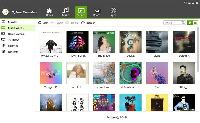 Po rychlé instalaci je program připravený k používání. Uživatelské rozhraní je poměrně prosté a čistě řešené, což pomáhá s jeho přehledností. Vzhledem k tomu, že jde primárně o iPhone/iPad manažer je třeba iOS zařízení připojit. Jakmile je nějaké iOS zařízení připojené, objeví se vám petice základních záložek dle pěti základních funkcí programu – Home, Music, Photos, Videos a Apps.