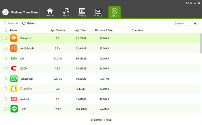 Poslední záložku tvoří Apps a překvapivě zde najdeme aplikace. Konkrétněji jde o seznam všech nainstalovaných aplikací, které máte ve vašem připojeném zařízení nainstalované. Vidíte jejich verzi, velikost a velikost přidružených souborů. V tomto okně můžete aplikace odstraňovat a to jak po jedné, tak i po několika zároveň. Aplikace o které již nestojíte stačí jen označit a zvolit možnost odstranit.