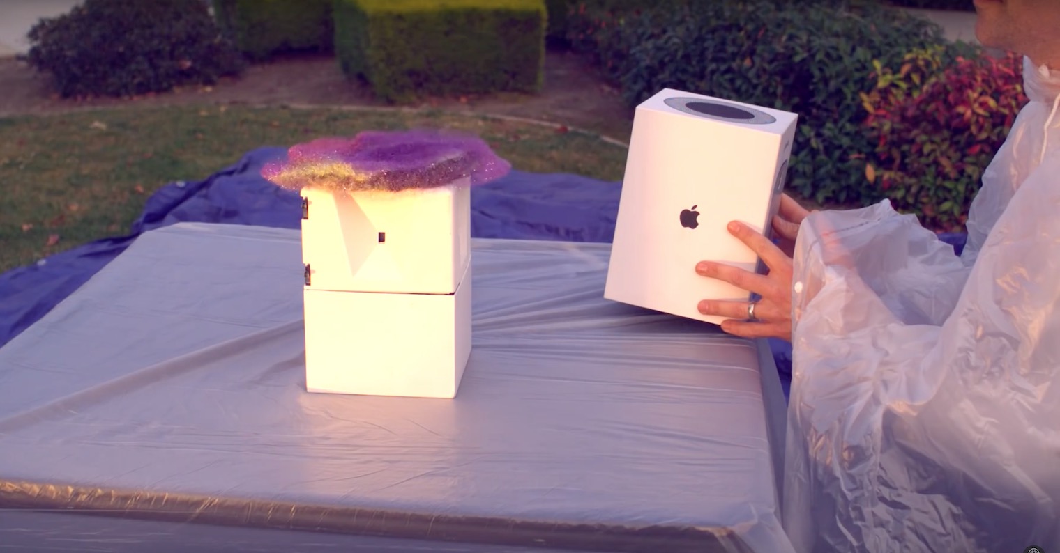 Rober vymyslel důmyslné zařízení, které se z venku tváří jako reproduktor HomePod od Applu. Ve skutečnosti však jde o kombinaci spirálové centrifugy, čtyř telefonů, flitrů, smrdutého spreje, zakázkově vyrobeného šasi a speciální základní desky, která tvoří mozek svého zařízení. Stálo jej to více než půl roku úsilí.