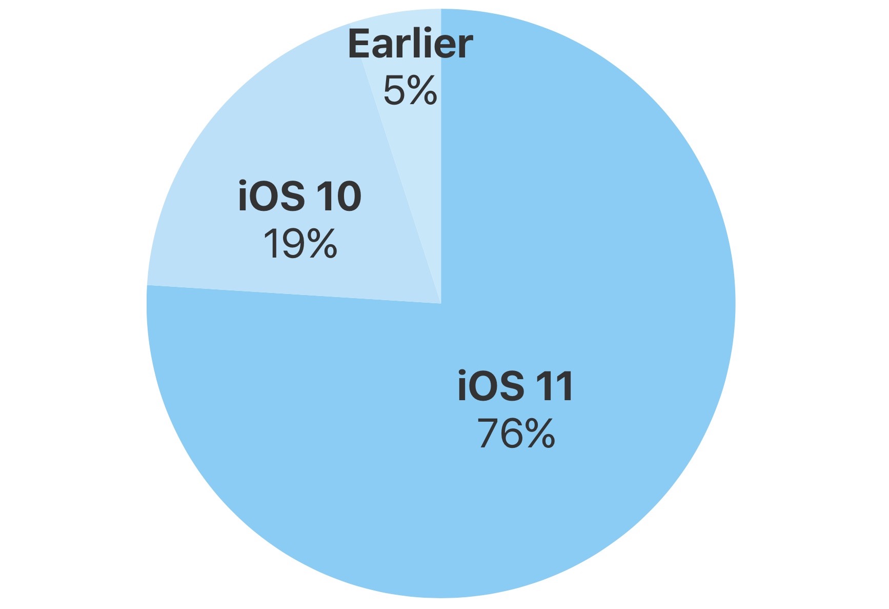 Z jednoduchého grafu se dozvídáme, že iOS 11 je na 76 % zařízení. Za poslední tři měsíce, tedy od poslední aktualizace statistik z 18. dubna, si tak iOS 11 nainstalovalo dalších 11 % uživatelů. Na předchozí verzi systému stále zůstává 19 % všech aktivních zařízení. Zbylých 5 % pak patří starším verzím systému, jako je iOS 9. Na většinu z těchto iPhonů a iPadů již není možné novější systém nainstalovat, uživatelé je ale i přesto aktivně používají.