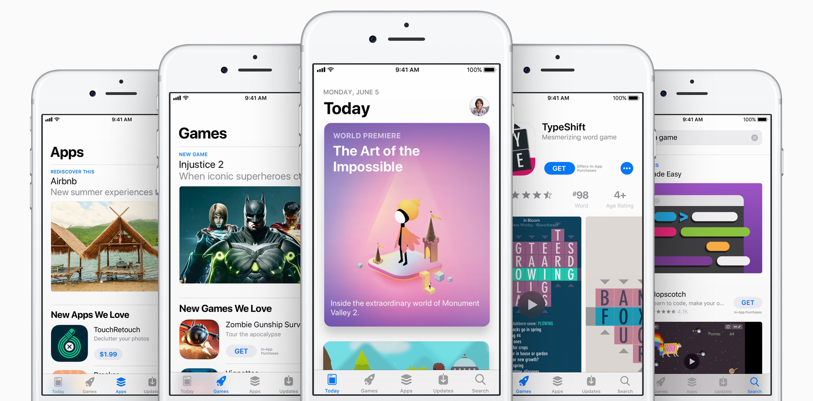 App Store v iOS 11 prošel další velkou obměnou, tentokrát pravděpodobně největší od data svého spuštění. Základní koncept je stále stejný – obchod je rozdělený do sekcí přístupných ze spodní lišty, hlavní stránka je rozdělena do sekcí podle výběru editorů, novinek a slev, jednotlivé aplikace mají vlastní stránky s informacemi a hodnocením apod.
