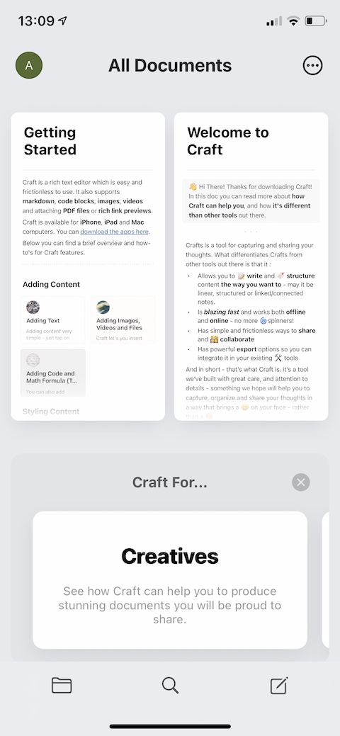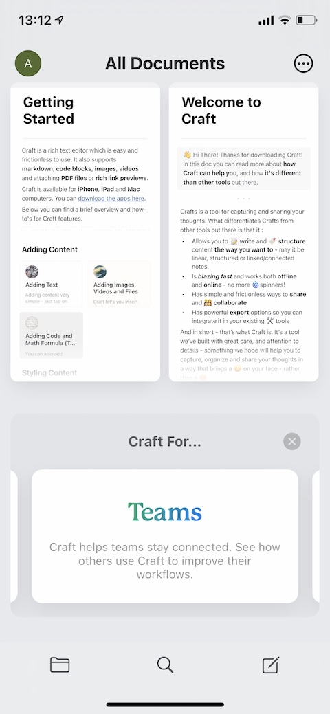 Po registraci (Craft bohužel zatím nepodporuje rychlé formy registrace, například prostřednictvím Sign in with Apple) a krátkém interaktivním návodu se vám zobrazí hlavní obrazovka samotné aplikace. Ta sestává ze spodní lišty s tlačítky pro přechod ke složkám, vyhledávání (s podporou hlasového zadávání) a tvorbu nového dokumentu. Vpravo nahoře se nachází tlačítko pro nápovědu a zpětnou vazbu, vlevo nahoře zase tlačítko pro správu vašeho profilu.