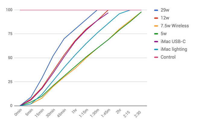 Výhody rychlého nabíjení jsou znatelné především v momentech, kdy na nabití telefonu nemáte dostatek času. V rámci testu, který provedl server AppleInsider, se také ukázalo, do jaké kapacity je možné telefon nabít za třicet minut. Klasická 5W nabíječka stihla baterii nabít na 21%, zatímco za pro iPad si vedla podstatně lépe – 36%. 29W nabíječka však nabila iPhone na velmi slušných 52%. To za 30 minut není vůbec špatný údaj. Po překonání 50% hranice se rychlost nabíjení zpomalí, kvůli snaze o co nejmenší poškozování baterie.