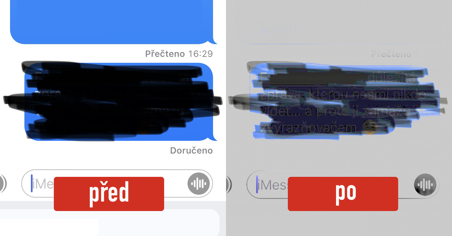 Výše uvedeným způsobem lze tedy na iPhone zobrazit obsah přeškrtaných zpráv. Určitě vás nyní zajímá, jakým způsobem se proti takovému „zneužití“ můžete bránit – rozhodně se nejedná o nic složitého. Pokud budete někomu posílat snímek obrazovky, ve kterém se nachází nějaký obsah, který sdílet nechcete, tak jej zaškrtejte klasickým štětcem a nikoliv zvýrazňovačem. Naprosto ideální je, abyste případně obsah úplně ořízli, pokud je to samozřejmě možné. Rozhodně si tu práci navíc v podobě několika sekund dejte – jak vidíte výše, tak proces zobrazení „zakrytého“ obsahu může trvat jen pár sekund.