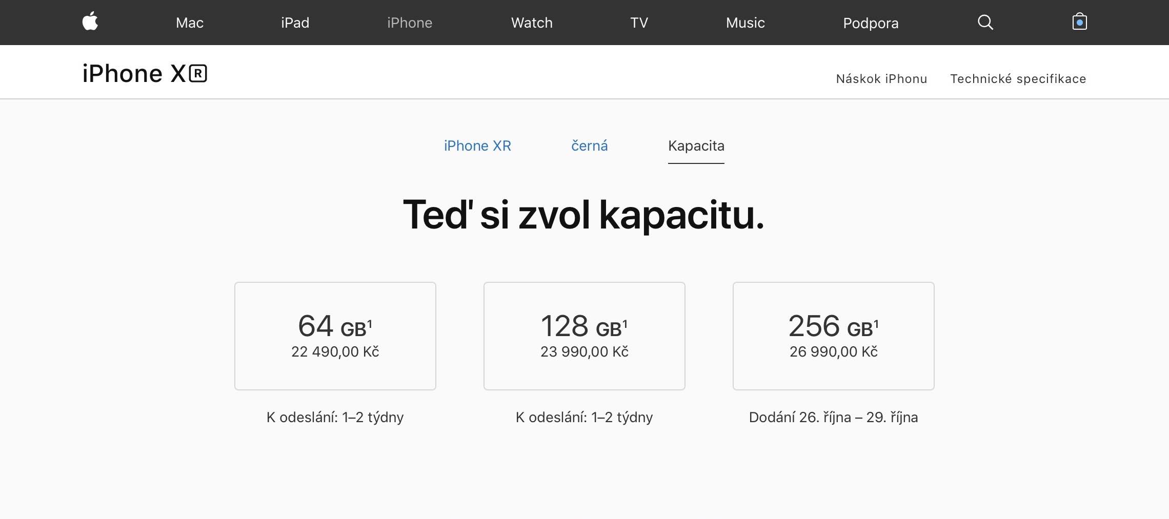 Pokud se podíváme do českého oficiálního obchodu společnosti Apple, všechny barevné a paměťové varianty iPhonu XR jsou nyní stále dostupné k 26. říjnu. Jinými slovy, pokud si je ještě dnes objednáte, v pátek vám dorazí. Výjimkou jsou 64 a 128 GB varianty v černém provedení, u kterých je dodání opožděno o jeden až dva týdny. Pravděpodobně tak jde o nejpopulárnější konfigurace, neboť jejich prodloužené čekací doby jsou podobné i na dalších trzích.