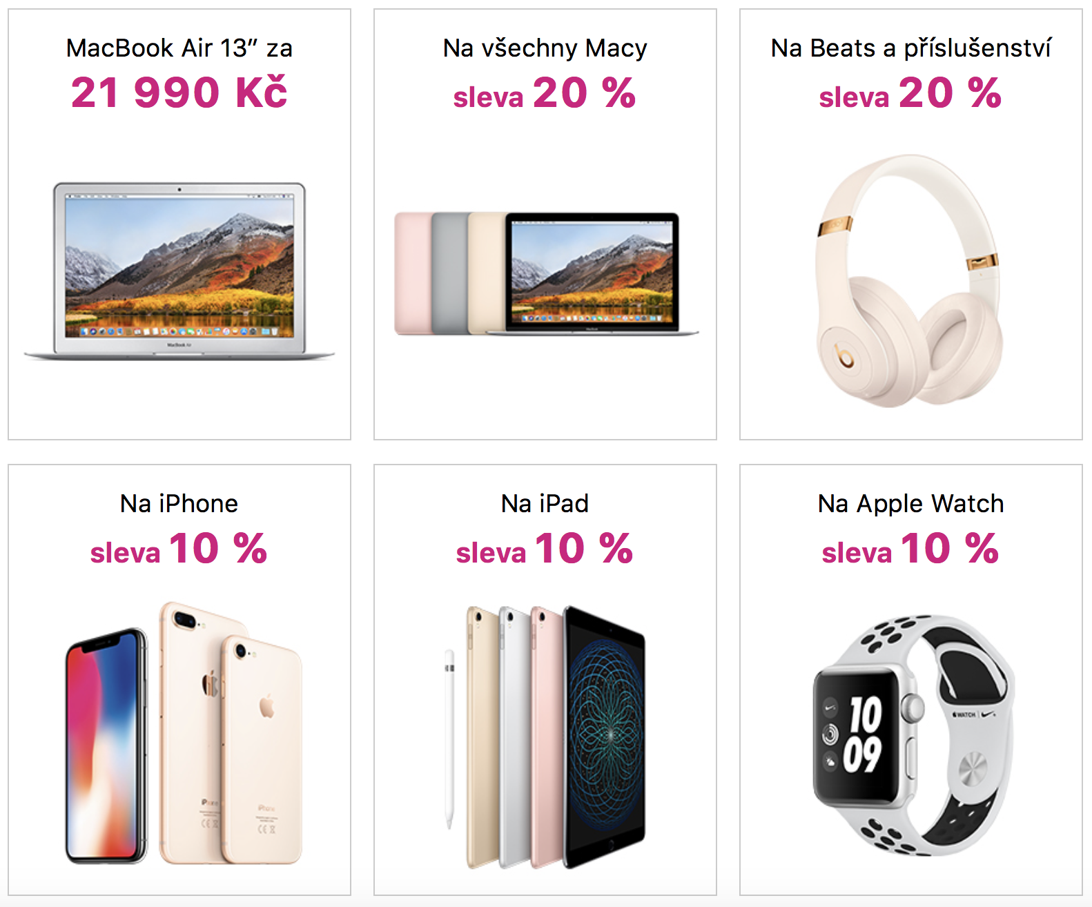 Na vybrané Apple produkty jsme pro Vás navíc přichystali speciální slevy. Tak si například budete moci pořídit Mac nebo sluchátka Beats se slevou až 20 % a iPad, iPhone nebo Apple Watch o 10 % levněji. Ještě jste o nás neslyšeli? Pak je načase to napravit! Jsme jedním z prémiových prodejců Apple v České republice. S jablíčkem ctíme společné hodnoty a to se odráží i na našem profesionálním servisu, osobitém přístupu k zákazníkovi a maximální možné péči a prémiových službách.