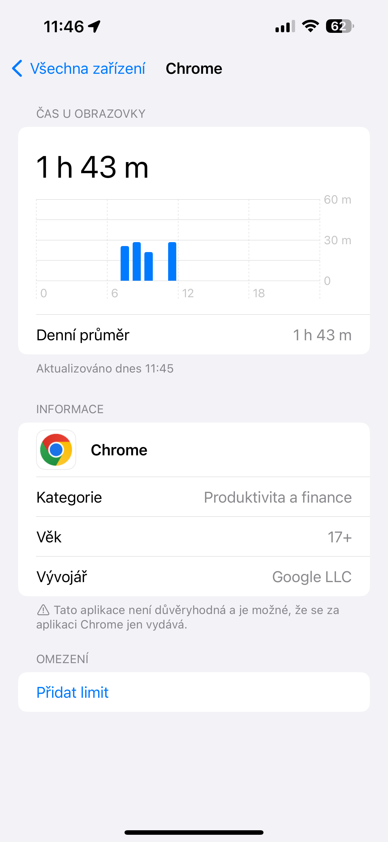 Na přítomných screenech si můžete všimnout i zajímavého vykřičníku u aplikace Chrome, tedy webového prohlížeče Googlu, který používám namísto Safari. Když si zde informaci rozkliknete, vidíte: „Tato aplikace není důvěryhodná a je možné, že se za Chrome jen vydává.“ K tomu mám hned několik otázek: „Jak může být nedůvěryhodná, když je v App Store – to zde nefunguje proces schvalování? Jak může být nedůvěryhodná, když je zde jako vývojář uvedený Google LLC?“