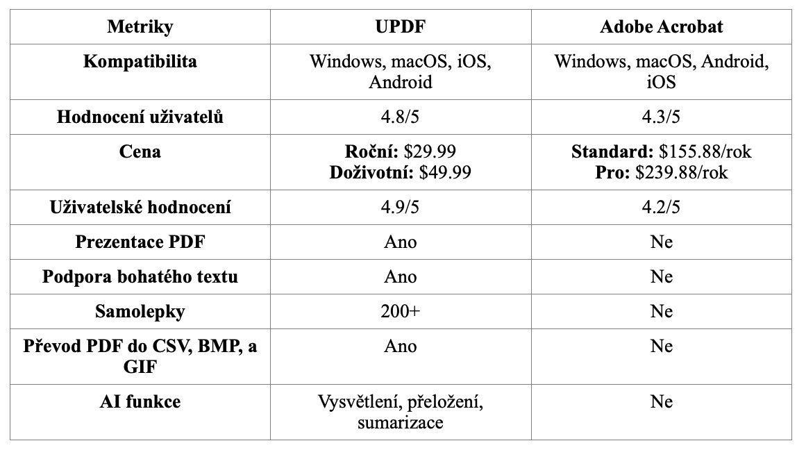 Přestože oba programy dokáží efektivně komprimovat soubory PDF pomocí snadno proveditelných kroků, UPDF se svými možnostmi pro kvalitu dokumentů a uživatelsky přívětivým rozhraním se ukazuje jako lepší volba. Pokud však potřebujete další přesvědčování, uvedli jsme několik hlavních bodů srovnání, které vám umožní učinit informované rozhodnutí týkající se výběru softwaru.