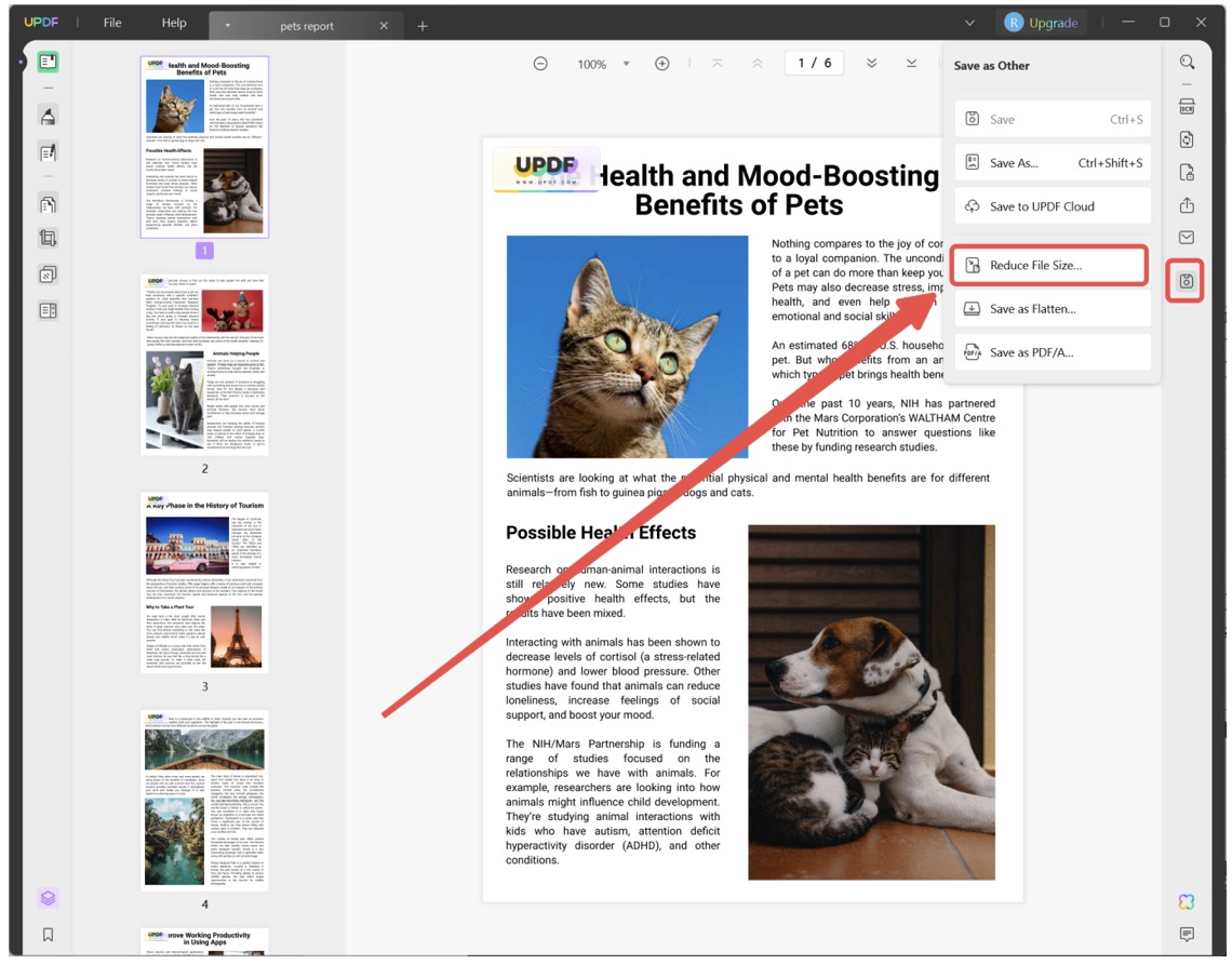 Po úspěšném nahrání souboru PDF na UPDF najděte a otevřete možnost „Uložit jako jiné“ na pravé straně obrazovky. Tím se na levé straně panelu otevře nabídka, která bude obsahovat různé možnosti, z nichž si můžete vybrat. Klepnutím na tlačítko „Reduce File Size…“ (Zmenšit velikost souboru…) otevřete v programu okno pro kompresi PDF.