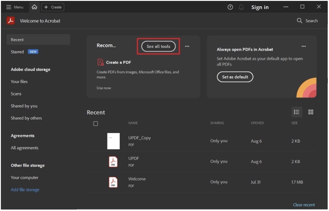 Krok 1: Otevřete Adobe Acrobat na pracovní ploše a klepnutím na tlačítko „Zobrazit všechny nástroje“ na domovské obrazovce získáte přístup ke všem nástrojům Adobe pro práci s PDF.
