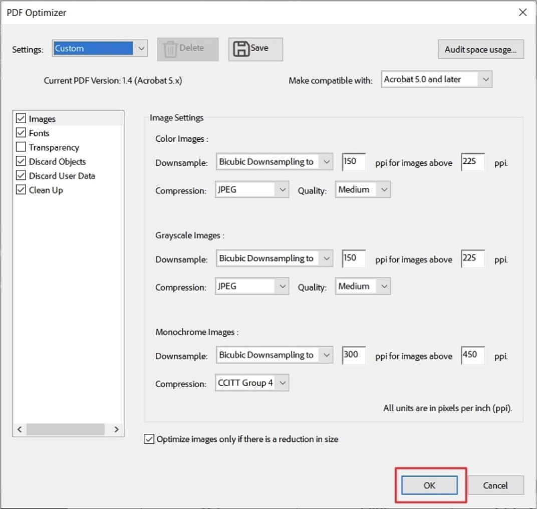 Krok 3: Poté můžete stisknout tlačítko „Pokročilá optimalizace“ a otevřít okno pro optimalizaci obsahu, například obrázků nebo písem komprimovaného souboru PDF. Po dokončení všech optimalizací stiskněte tlačítko „OK“ a kliknutím na možnost „Uložit“ v okně „Uložit jako“ exportujte optimalizovaný dokument do systému.