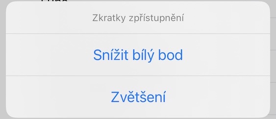 Pomocí výše uvedeného postupu jste nastavili jednoduchou možnost pro snížení jasu pod minimální úroveň. Kdykoliv pak budete chtít tuto vychytávku (de)aktivovat, tak stačí, abyste třikrát po sobě stisknuli boční tlačítko v případě iPhonu s Face ID, na starších iPhonech s Touch ID pak stiskněte třikrát po sobě tlačítko plochy. Ve spodní části obrazovky se pak objeví menu, ve kterém (de)aktivujte Zvětšení a Snížit bílý bod. Pokud provedete aktivaci pouze jedné možnosti, tak se jas sníží o jednu úroveň pod minimální úroveň, pokud aktivujete obě možnosti, tak se sníží dvě úrovně pod minimální jas.