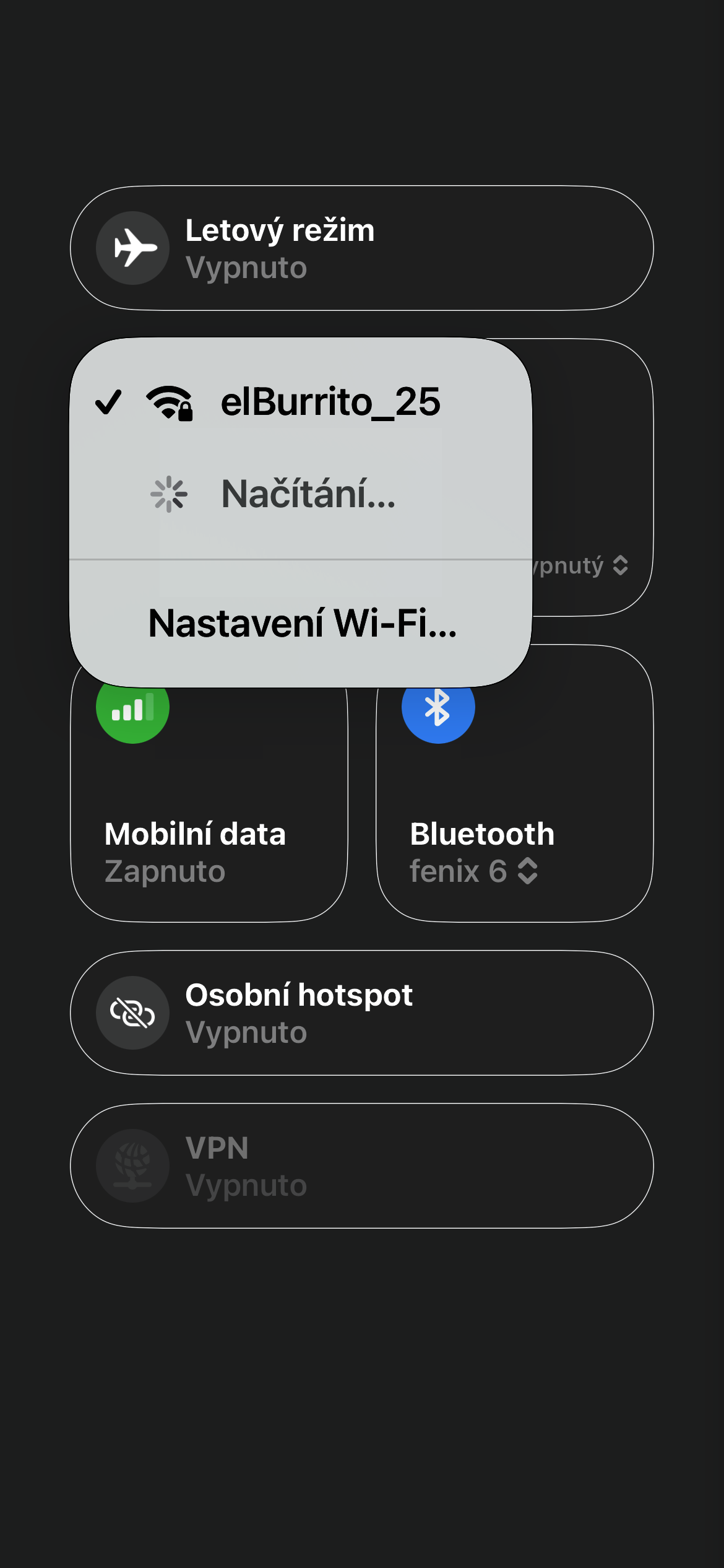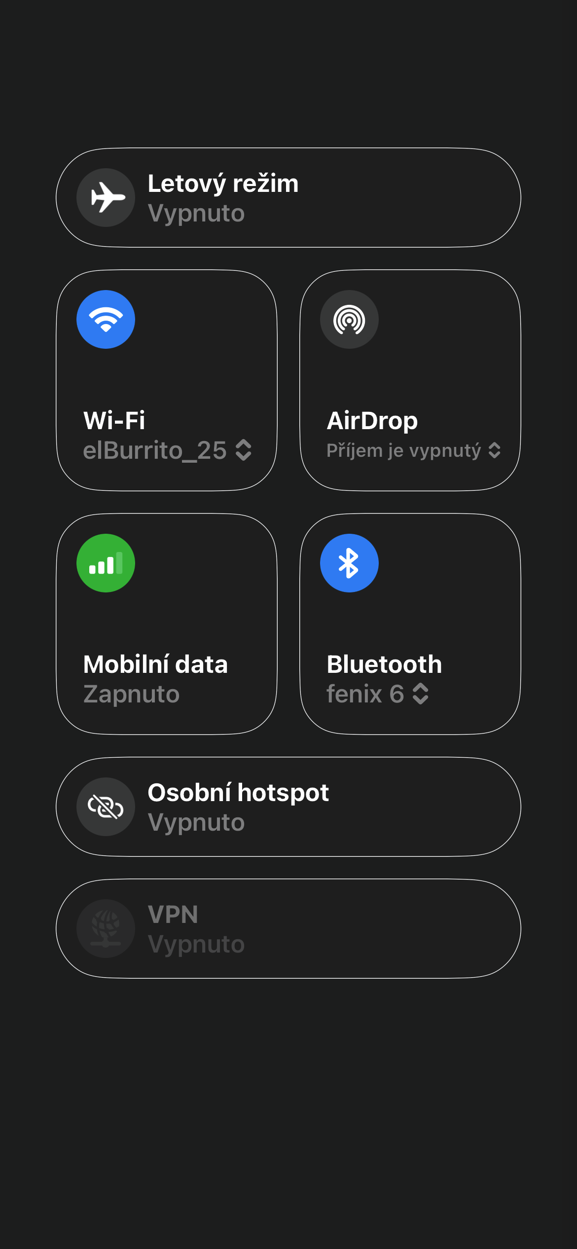 Alternativně lze stejný postup provést i přes skupinu Konektivita v levém horním rohu Ovládacího centra, kde najdete i Bluetooth, Mobilní data, AirDrop, VPN či Osobní hotspot – v tomto případě je ale potřeba ještě rozkliknout samotný název Wi-Fi sítě.
