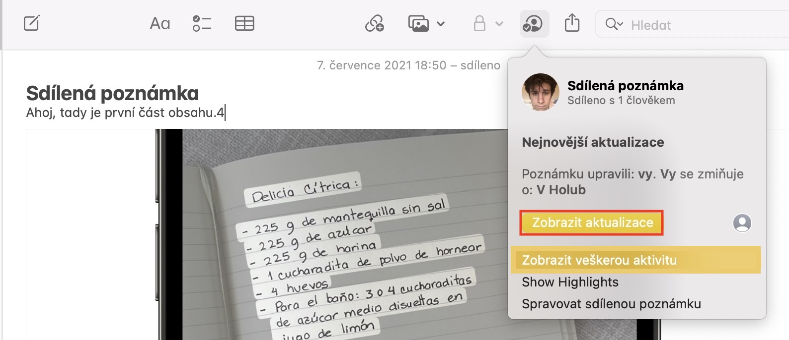 Prostřednictvím výše uvedeného postupu je tedy možné na Macu v Poznámkách zobrazit historii aktivity. Pokud v rámci vybrané poznámky proběhly nějaké úpravy od vašeho posledního otevření, tak si je můžete jednoduše zobrazit klepnutím na možnost Zobrazit aktualizace po stisknutí ikony uživatele s fajfkou. Pro zobrazení historie aktivity můžete využít také alternativní postupy – buď můžete klepnout na záložku Zobrazení v horní liště, a poté vybrat Zobrazit aktivitu poznámek, popřípadě můžete využít klávesovou zkratku Control + Command + K.