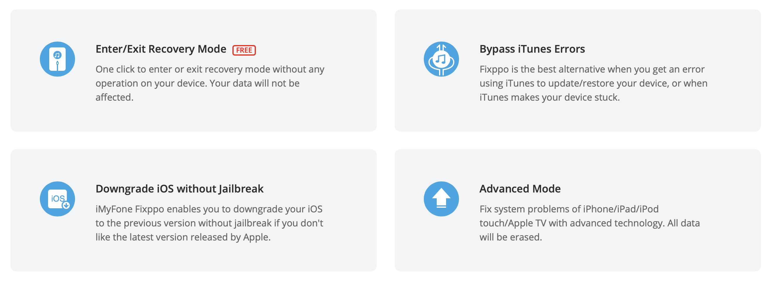 Mezi další funkce iMyFone Fixppo iPhone Repair software patří například jednoduchá možnost provedení downgrade, což se hodí například tehdy, pokud nejste s novým systémem spokojeni, anebo pokud chcete do vašeho zařízení nahrát jailbreak a nyní už běžíte na takové verzi iOS, pro kterou není jailbreak k dispozici. Kromě toho můžete iPhone či iPad jednoduše pomocí jednoho kliknutí převést do režimu zotavení. Dále lze Fixppo využít jako alternativu za iTunes (či Finder v macOS), pokud se například při použití iTunes (či Finderu v macOS) objeví různé chyby, anebo pokud s ním nejste jednoduše spokojeni.