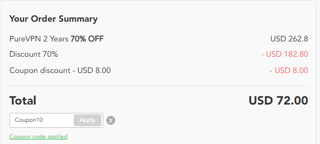 Jestliže vás výše uvedená možnost pro sledování obsahu, který je dostupný jen v určitých zemích, zaujala, tak pro vás máme skvělou zprávu. Jak už jsme zmínili výše, tak jsme si pro vás s PureVPN připravili speciální akci, díky které je možné získat předplatné PureVPN s až 70% slevou. Konkrétně lze tuto 70% slevu využít na dvouletý plán předplatného. Klasicky byste za tento plán zaplatili přes 260 dolarů, pokud však využijete akci a k tomu také speciální kupón, tak se dostanete na pouhých 72 dolarů za dva roky, což je zhruba 3,3 dolarů za měsíc. Takovou cenu rozhodně u konkurence nezískáte a věřte, že se taková akce nebude dlouho opakovat. Pro využití akce se stačí přesunout na tyto stránky, vybrat si dvouletý plán předplatného, a poté do příslušného pole vepsat slevový kód Coupon10.