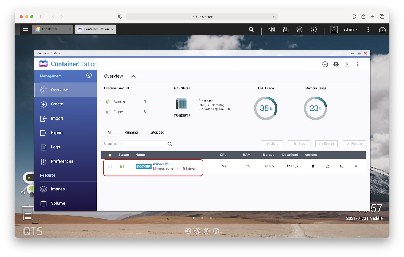 Jakmile se začne náš server vytvářet, můžeme se v levém panelu přepnout do záložky Overview, kde už uvidíme náš kontejner. Když jej otevřeme, ihned uvidíme konzoli našeho serveru a zprávy o generování světa. V tomto okamžiku už jen stačí spustit Minecraft a v možnostech hry pro více hráčů zadat IP adresu, kterou jsme si sami zvolili. Voilà – máme plně funkční Minecraft server, jenž běží na našem domácím úložišti QNAP.