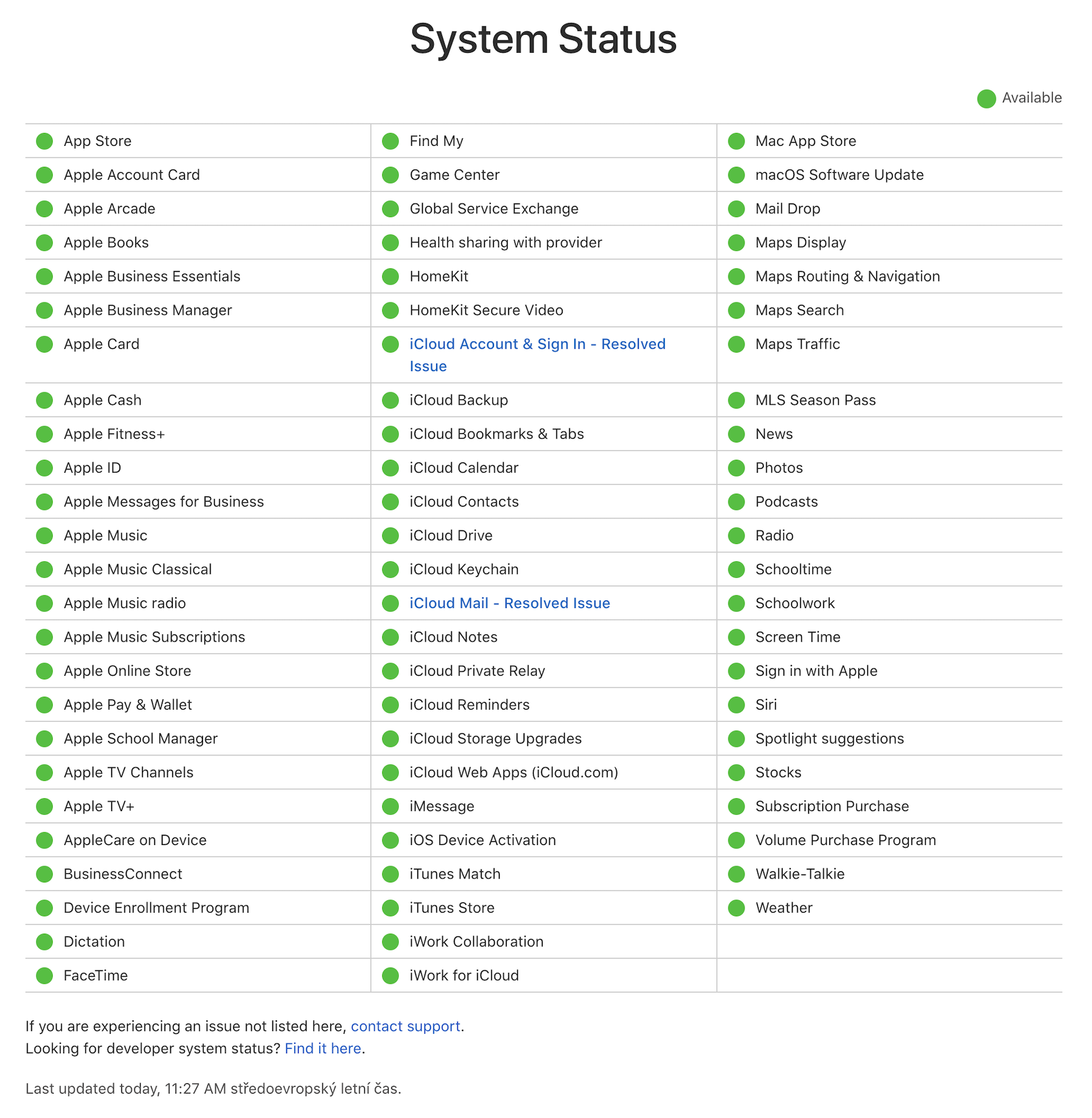 Stránka System Status, kterou najdete na podpoře Applu zde, informuje o jednotlivých službách a funkcích společnosti napříč zařízeními. Pokud je vše funkční tak, jak má, najdete u každé zelenou ikonu. Jakmile ale daná služba nebo funkce vypoví poslušnost, tak to zde uvidíte na první dobrou.