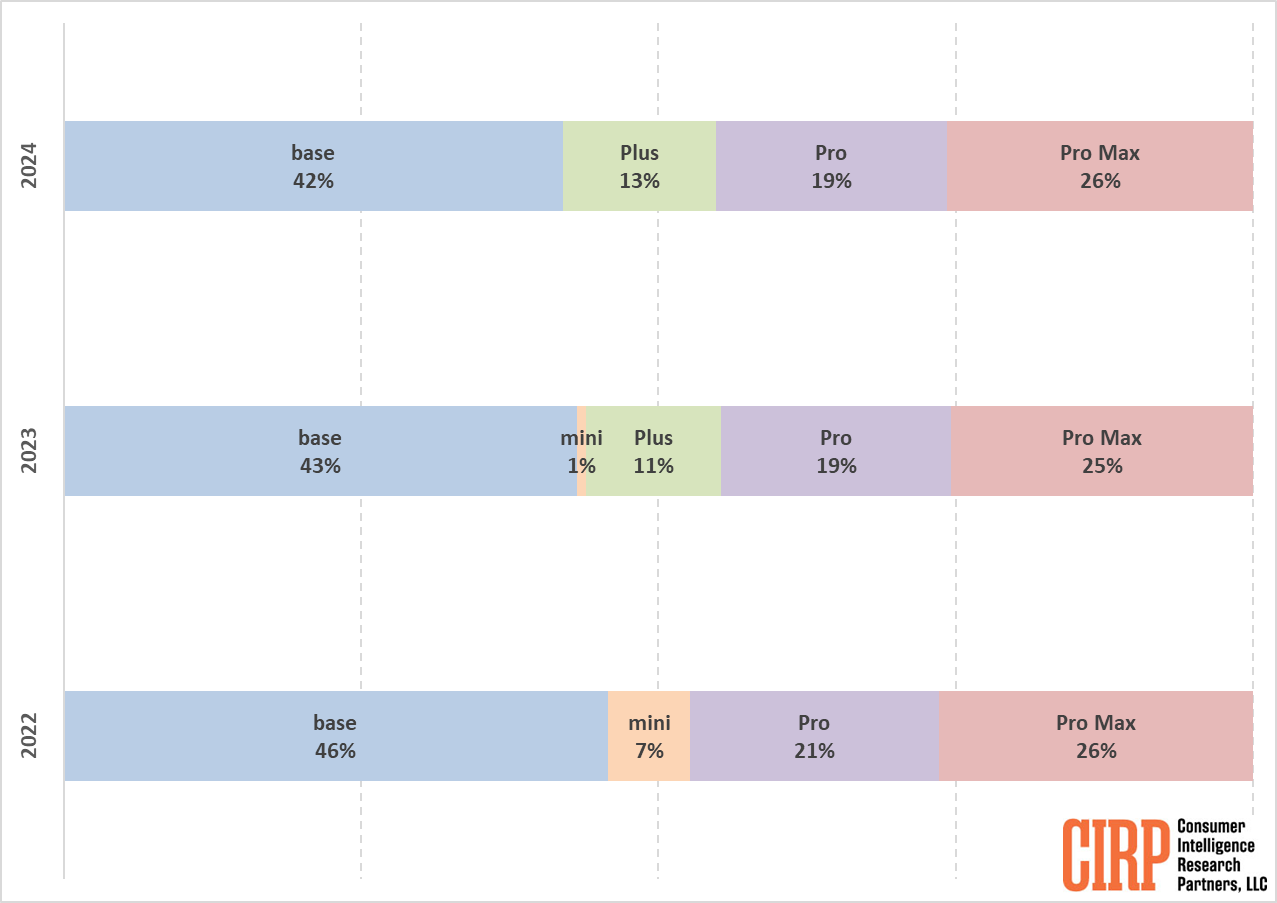 Základní iPhone si pro sebe v roce 2022 uzmul 46 % všech prodaných iPhonů, v roce 2023 to bylo 43 % a v roce 2024 42 %. Mohlo by to tedy vypadat, že je nejpopulárnější, jenže analýza nezmiňuje konkrétní model a tím pádem jsou tato data zavádějící. Ve skutečnosti je tak jednoznačně nejprodávanějším iPhonem Pro Max, který se stabilně drží kolem 26% podílu.