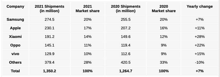 Na globální smartphonový trh bylo v loňském roce dodáno celkem 1,35 miliardy zařízení, což představuje meziroční růst o 7 %. První místo znovu obhájil Samsung, který vyexpedoval 274,5 milionu chytrých telefonů a jehož tržní podíl dosáhl (stejně jako předloni) 20 %. Informovala o tom analytická společnost Canalys. Na druhém místě skončil s 230 miliony dodaných smartphonů a tržním podílem 17 % Apple (meziročně zaznamenal 11% růst), na třetím pak Xiaomi, které na trh dodalo 191,2 milionu smartphonů a drží podíl 14 % (z roku na rok rostlo o vysokých 28 %).