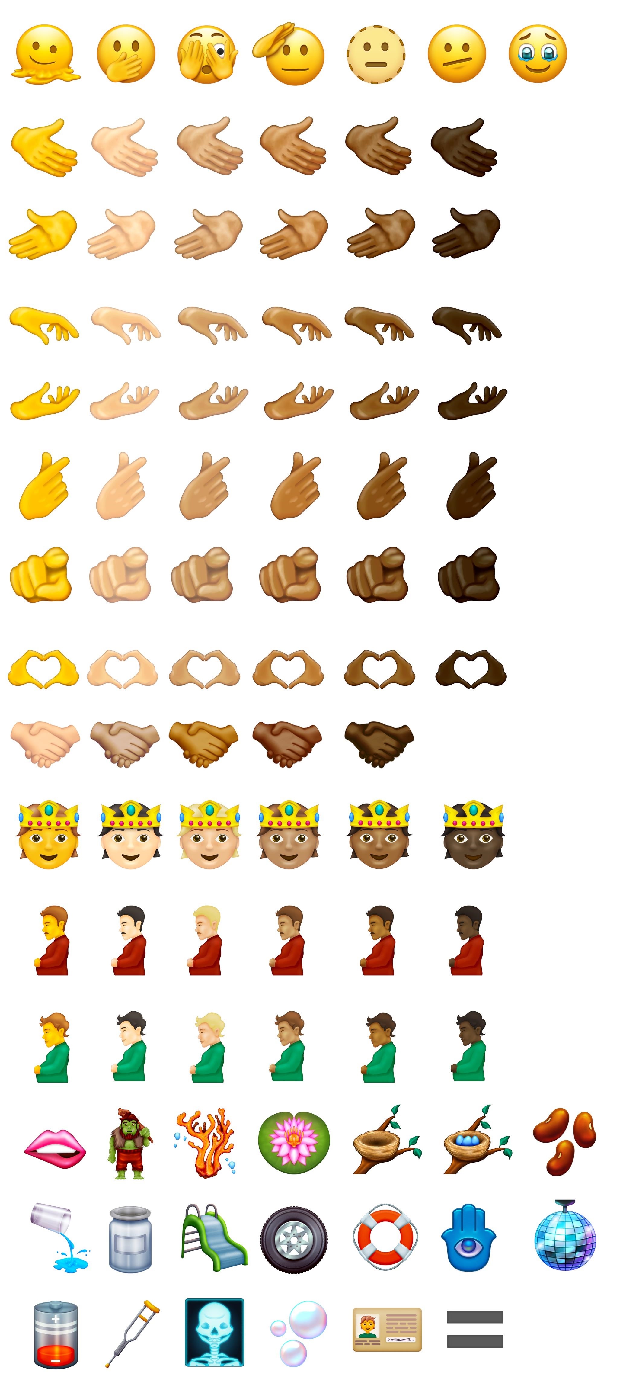 Měli jsme se dočkat 37 nových emodži s tím, že deset z nich má dohromady dalších 50 variant odstínů pleti kromě standardní žluté. Jeden již existující emotikon, tedy podání ruky, pak získává dalších 25 různých kombinací svých variant. Poslední významné vydání emotikonů do zařízení Applu přišlo v iOS 14.5 a iPadOS 14.5 už 26. dubna 2021 a přineslo celkem 226 nových emotikonů, aktualizací a variací odstínů pleti.