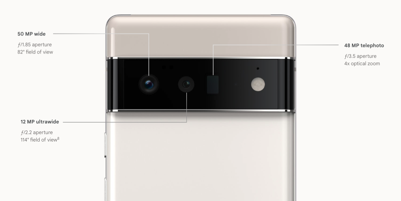 Na zadní straně Pixelu 6 Pro je umístěn 50MPx primární snímač se clonou ƒ /1,85 a OIS, dále 48MPx teleobjektiv se 4× optickým přiblížením a clonou ƒ/3,5 a OIS a 12MPx ultraširokoúhlý objektiv se clonou ƒ/2,2. Sestava je doplněna ještě laserovým senzorem automatického zaostřování. Apple iPhone 13 Pro Max nabízí trojici 12MPx fotoaparátů. Širokoúhlý u něho disponuje clonou ƒ/1,5, trojnásobný teleobjektiv clonu ƒ/2,8 a ultraširokoúhlý clonu ƒ/1,8, kde širokoúhlý objektiv disponuje stabilizací s posuvem snímače a teleobjektiv OIS.