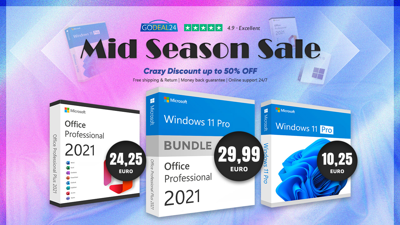 S Godeal24 si můžete přijít na doživotní licenci pro office 2021 Pro za pouhých 24,25 $ nebo na originální licenci pro Windows 10 Pro jen za 7,25 $. Aby toho nebylo málo, využít můžete i časově omezenou nabídku a získat Windows 11 Pro jen za 10,25 $. Ušetřit můžete i více při nákupu zvýhodněných balíčků Windows OS + Office. Licence na MS Office 2021 je dostupná již od 13,05 $/PC, což ve srovnání s originální cenou 439,99 $ představuje více než 90% zlevnění! Posuňte tak svou produktivitu na zcela novou úroveň se zvýhodněnými balíčky na Godeal24!
