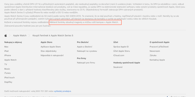 Když se pozorně začtete do drobného písma ve spodní části stránky s nabídkou řemínků k Apple Watch na webu Applu, můžete si všimnout poznámky s informací o tom, že magnety obsažené v některých typech řemínků mohou rušit kompas Apple Watch. Jedná se například o řemínky milánský tah, Modern Buckle nebo kožený řemínek se smyčkou. Mezi řemínky, které magnety neobsahují, patří sportovní řemínky, Sport Loop, Nike, Hermès nebo Link Bracelet.