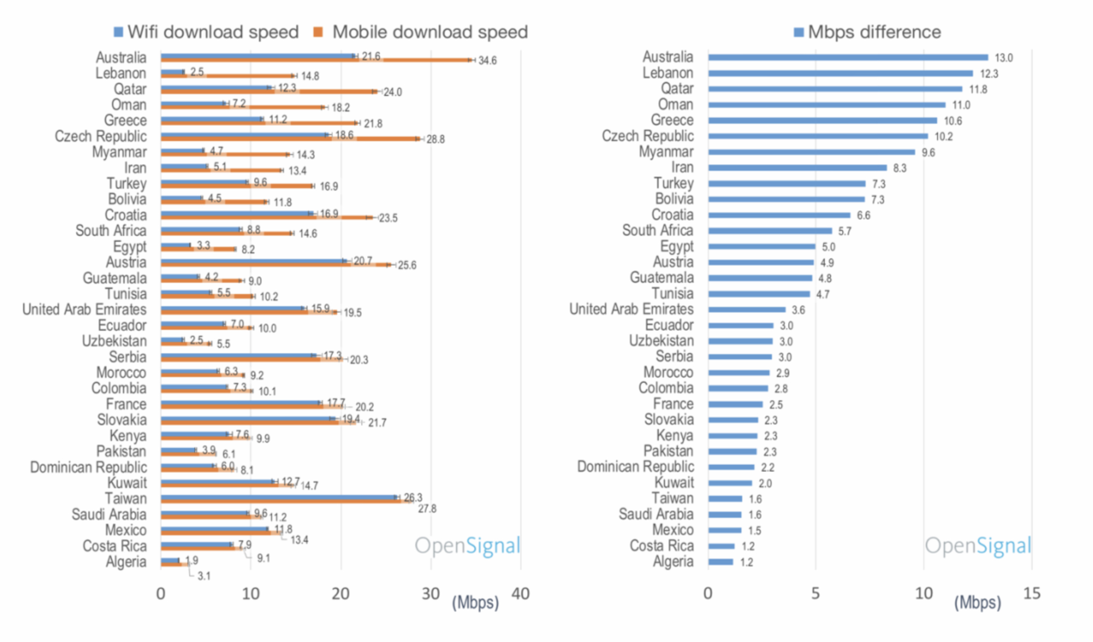 Z uvedených informací se tak může zdát, že velmoci jako USA, Japonsko, Jižní Korea nebo Singapur poněkud zaostávají. Avšak tento průzkum je zavádějící, protože se zaměřuje především na rozdíl mezi rychlostmi připojení a dává přednost zemím, ve kterých mobilní připojení vede. V případě České republiky jsou uvedeny rychlosti 18,6 Mbps u Wi-Fi a 28,8 Mbps u mobilního připojení. V grafu tak například nejsou vidět země, které se jako Jižní Korea mohou chlubit ohromnou rychlostí mobilního připojení o 45 Mbps a ještě rychlejší Wi-Fi s 56,3 Mbps.