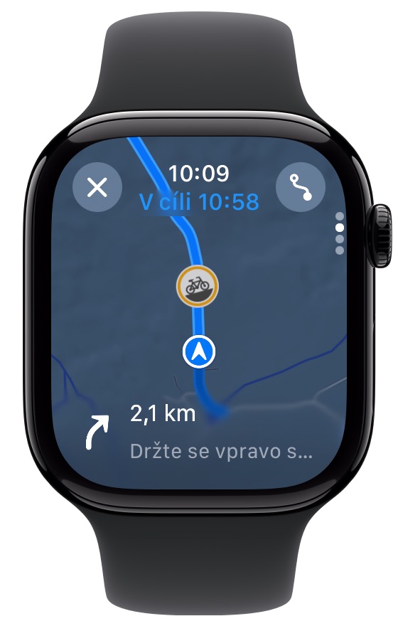 Cyklistické trasy v Mapách fungují skvěle také na Apple Watch. Stávající cyklistické funkce specifické pro Apple Watch zahrnují přehled nadmořské výšky podél trasy, hmatový dotyk pro podrobnou navigaci a hlasovou zpětnou vazbu o rychlosti a vzdálenosti z vestavěného reproduktoru hodinek.