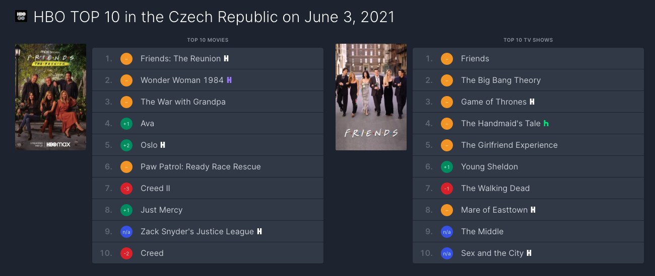 Pokud nevíte, na co o víkendu koukat, tak vám přinášíme žebříček HBO GO TOP 5 v České republice k 4. červnu 2021. Na první příčce filmů se usadil speciál seriálu Přátelé: Zase spolu, kde se sešli všichni staří známí protagonisté. Přátelé však vévodí i seriálovému žebříčku. Ten každý den sestavuje server FlixPatrol.