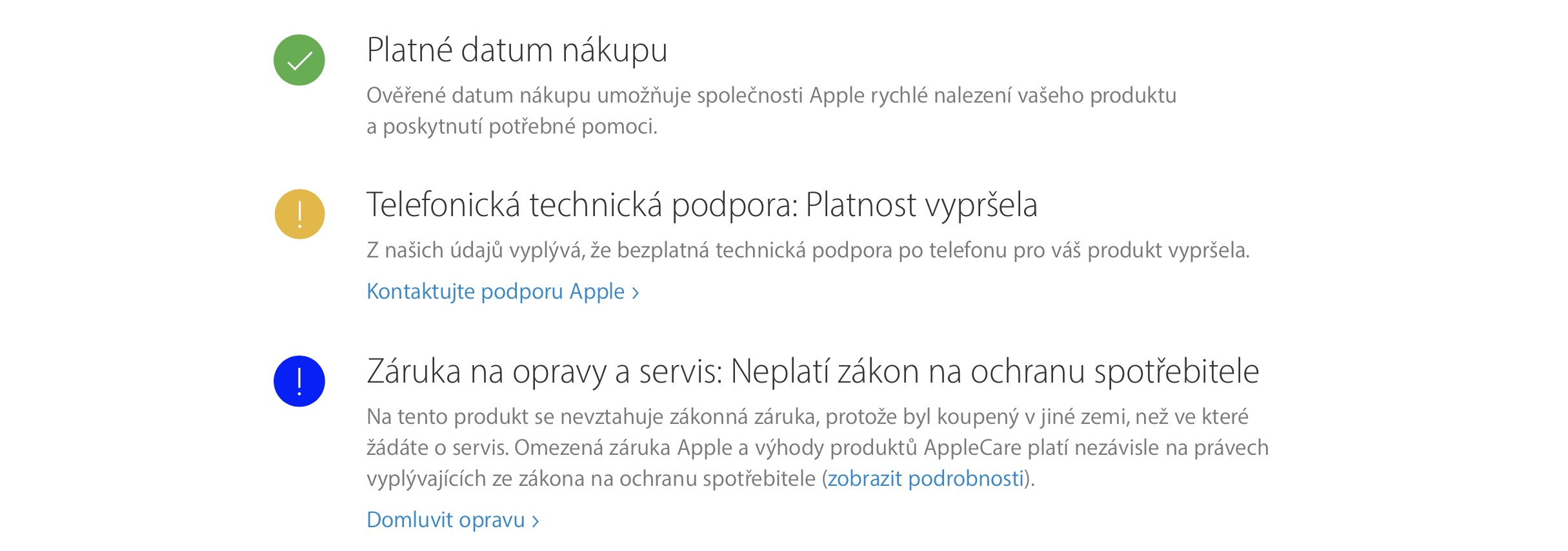 Pokud vám prodejce tvrdí, že je zařízení v záruce, tak se o této skutečnosti můžete přesvědčit na stránkách od Applu – Ověření krytí. Zde stačí do příslušného políčka zadat IMEI či sériové číslo zařízení (Nastavení -> Obecné -> Informace). Po stisknutí tlačítka Pokračovat se na obrazovce objeví informace o tom, zdali ještě na zařízení platí záruka. Klasická záruční doba na zařízení je v ČR 2 roky, pokud bylo však zařízení kupováno na IČO či tzv. „bez DPH na firmu“, tak je záruka pouze jeden rok. V případě, že bylo zařízení dovezeno například ze Spojených států, tak je záruka taktéž jeden rok.