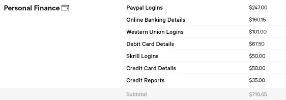Autoři reportu dali dohromady informace o tom, jak cenné jsou různé typy internetových účtů. Dá se očekávat, že mezi ty nejdražší budou patřit účty spojené s financemi, ať už jde o přístupové údaje do různých portálů internetového bankovnictví, detaily o kreditních kartách apod. Nejdražší přístupové údaje vyjdou zájemce na téměř 250 dolarů. V tomto případě se jedná o loginy do sítě PayPal. O něco levnější jsou přístupy do internetových bankovnictví, do systémů pro správy kreditních karet apod.