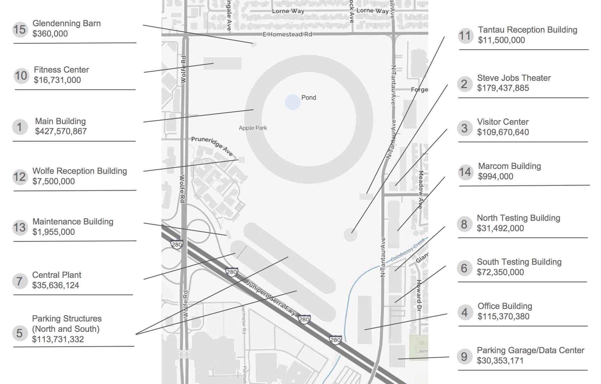 Původní článek s detailním rozborem a popisky najdete zde. Autorka tohoto rozboru ve svém textu vysvětluje, že se jí podařilo, za použití databáze z praxe, odhadnout minimální ceny všech doprovodných budov, které se v Apple Parku nachází. Zaměřila se na patnáct hlavních objektů v celém komplexu.