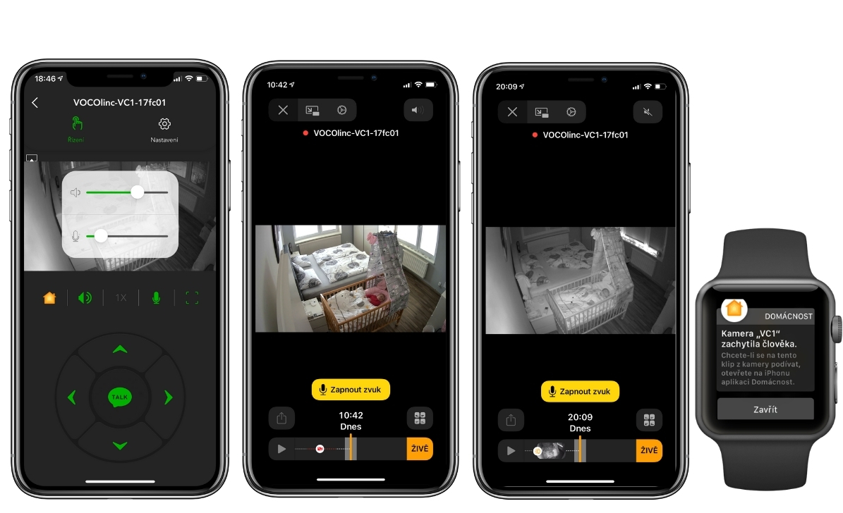 Kamera je vybavena objektivem, který umožňuje 350° horizontální a 117° vertikální rotaci, takže dohlédne skutečně na celou místnost. Zkontrolujete tak třeba vaše děti, které se vrátily domů ze školy a díky obousměrné komunikaci (vestavěný mikrofon i reproduktor) je rovnou můžete také pozdravit. Noční režim poskytuje dobrou viditelnost (až 6 m), takže kameru využijete i jako dětskou chůvičku. Funkce otáčení kamery je dostupná v aplikaci VOCOlinc.