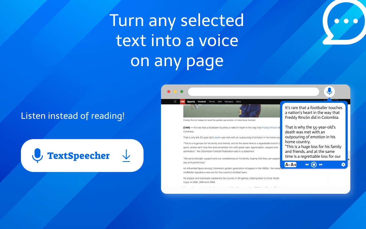 S rozšířením TextSpeecher si vychutnáte webové stránky bez námahy, ať už se jedná o zpravodajské články, blogy, fanouškovskou literaturu, publikace, učebnice, školní portály nebo online kurzy. TextSpeecher je promění na poutavé audio zážitky. TextSpeecher zvládne převést na zvuk i soubory PDF, Dokumenty Google, knihy Google Play, Amazon Kindle a EPUB, takže si můžete vychutnat své oblíbené příběhy a knihy, ať už jste kdekoli. Navíc si můžete vybrat hlas dle libosti – TextSpeecher nabízí širokou škálu hlasů, včetně těch, které jsou nativně dostupné ve vašem prohlížeči. TextSpeecher vám přinese snazší studium a práci, ať už se jedná o čtení studijních materiálů, psaní esejů nebo přípravu na zkoušky. Zpřístupňuje webový obsah i osobám se zrakovým postižením, čímž otevírá dveře do světa informací a zábavy pro všechny.