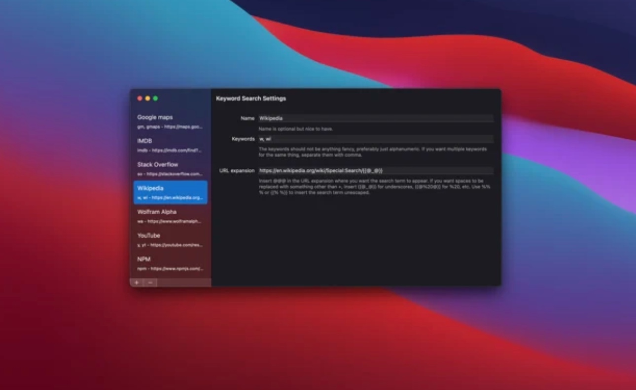 Rozšíření s názvem Keyword Search vám umožní snadno, rychle a efektivně procházet internet v Safari na vašem Macu bez nutnosti využívání dalších vyhledávacích nástrojů. Toto rozšíření navíc skvěle spolupracuje s platformami, jako je třeba Wikipedia nebo WolphramAlpha, a umožňuje využívání zkratek. S pomocí Keyword Search můžete provádět také nejrůznější výpočty, zjišťovat funkčnost vybraných webových stránek a spoustu dalšího.