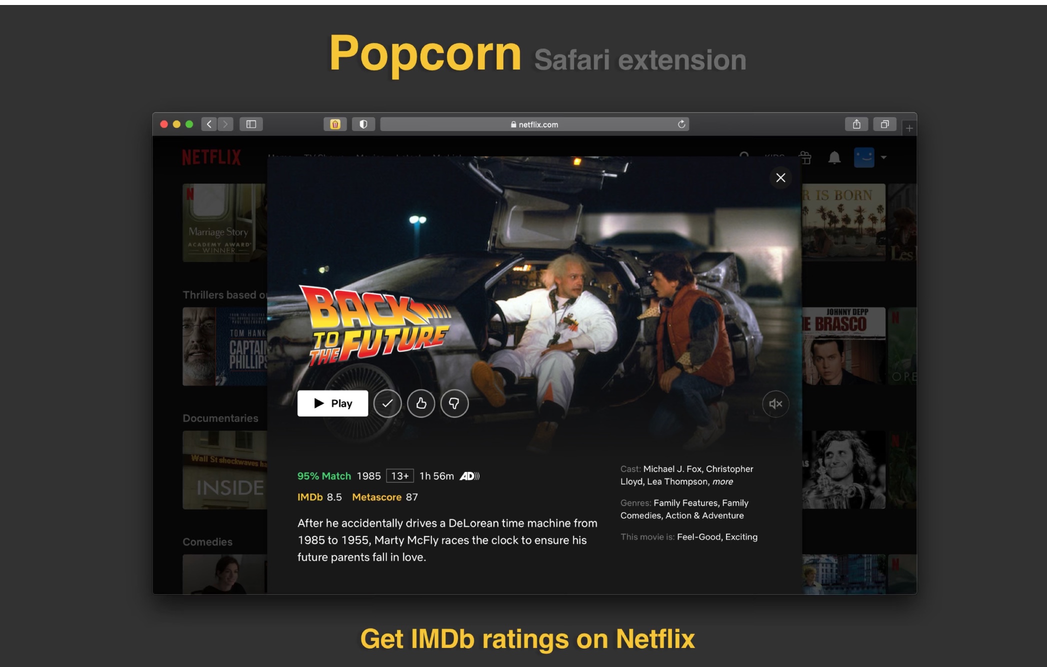Popcorn je skvělé a velmi užitečné rozšíření pro všechny, kteří milují sledování nejrůznějších seriálů a filmů na streamovací službě Netflix. S pomocí tohoto rozšíření se budete moci kdykoliv okamžitě dozvědět, jakého hodnocení se vámi vybraný film nebo pořad na Netflixu dočkal na webu IMDb nebo Metascore. Rozšíření je bez reklam a nevyužívá žádné sledovací nástroje.