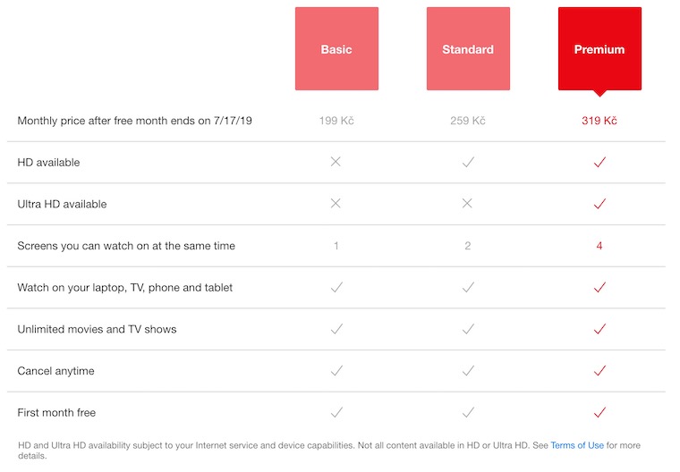 Netflix nabízí trojici plánů za 199, 259 a 319 korun, podrobnosti naleznete v tabulce níže