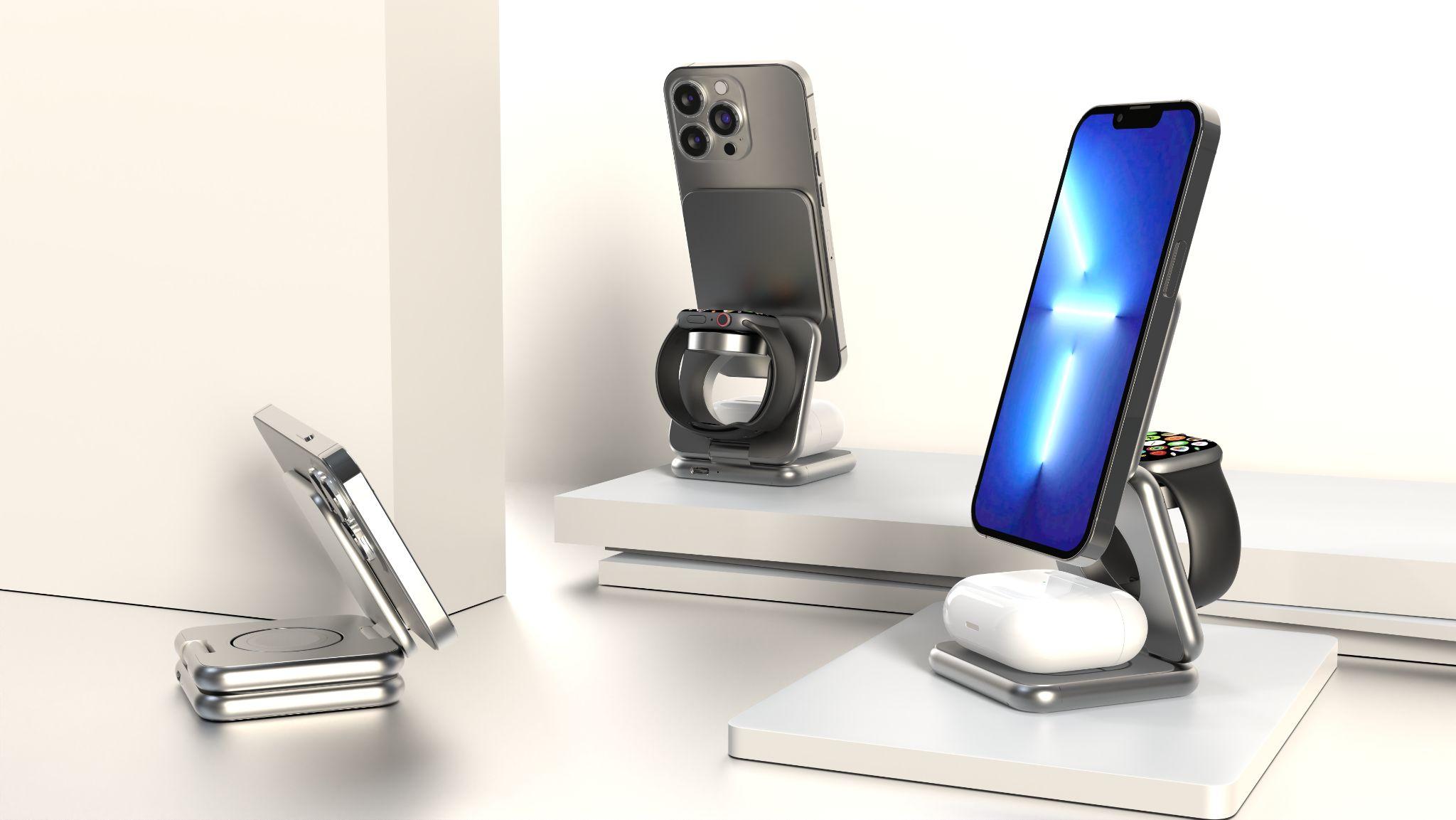 Jedná se o bezdrátovou nabíječku v konstrukčním provedení 3v1, na kterou lze položit Apple Watch, AirPody (či jakékoliv jiné zařízení s podporou Qi) a samozřejmě iPhone pomocí MagSafe. Speciální vyklápěcí nabíječka pro hodinky podporuje rychlonabíjení Apple Watch 7. a 8. série a bez problémů na ni položíte hodinky s jakýmkoliv páskem. Nabíječka má i manažera nabíjení, který automaticky vypne nabíjení po plném nabití telefonu nebo sluchátek.