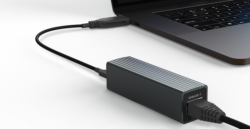 Adaptér QNA-UC5G1T lze připojit k dalším zařízením pomocí kabelu USB typu A nebo typu C. Je to zařízení, které se vejde do dlaně, a je pasivně chlazené pro snadné a dlouhodobé používání.