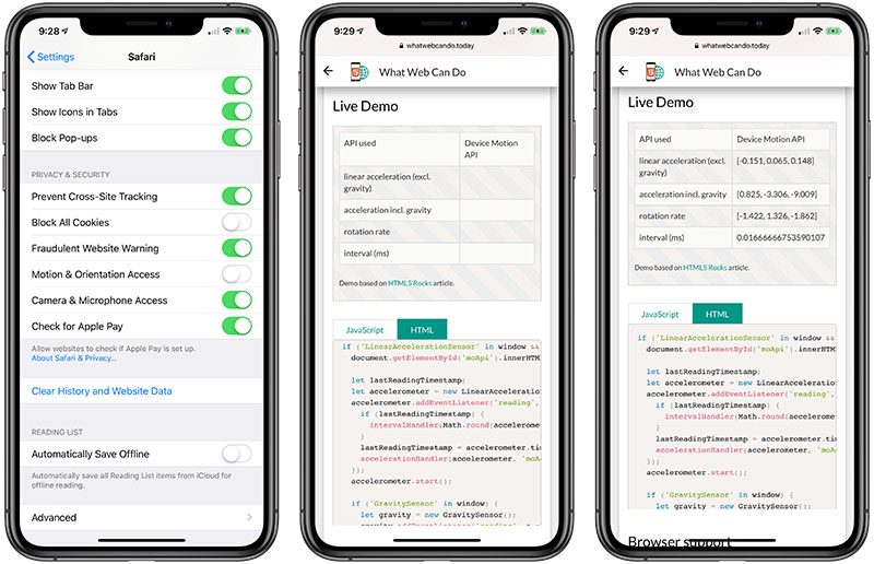 Apple v nové aktualizaci iOS 12.2, která je aktuálně ve fázi testování, omezil přístup k akcelerometru a gyroskopu v Safari kvůli ochraně soukromí. Pokud tedy budete chtít funkce při prohlížení stránek používat, budete je muset zapnout v Nastavení.